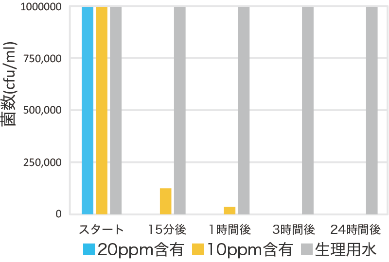 20ppmでは15分の浸漬でコロニーは確認できなくなった。10ppmでは24時間浸漬後にコロニーが確認できなくなった。